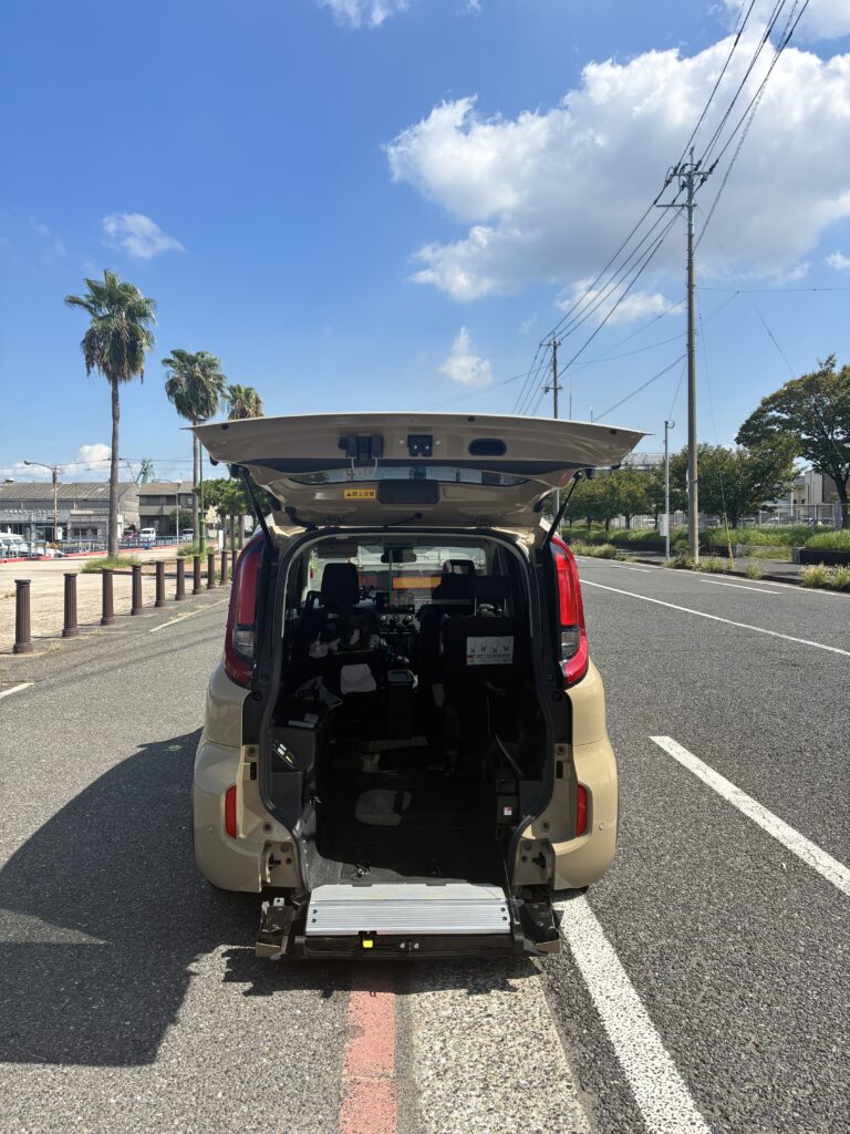 当社の車両は車椅子対応設備として、バックドアを開けると同時に車高が降下し、ショートスロープが展開、省スペース&短時間で乗降可能です。
